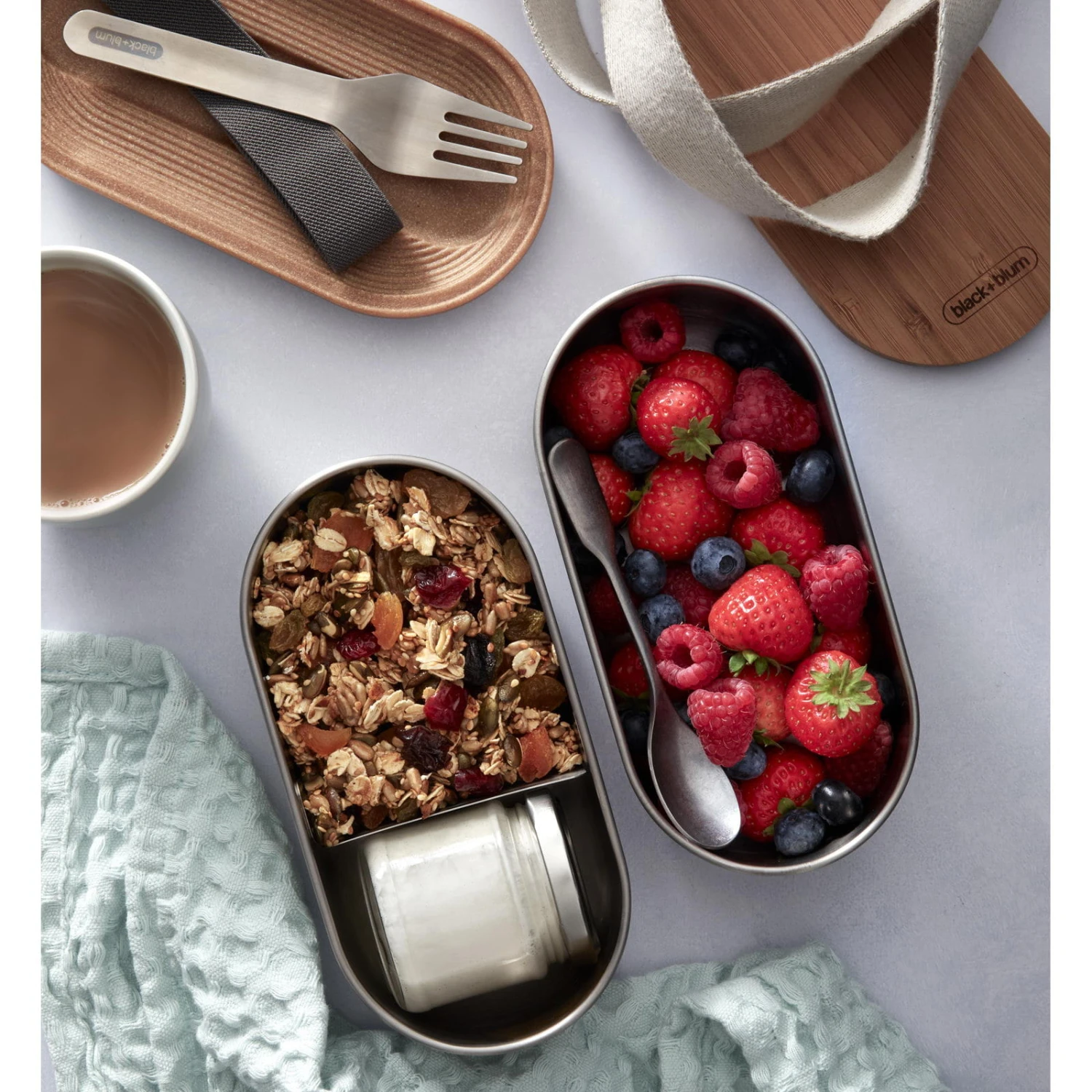 Die Stainless Steel Bento Box von black+blum ist eine auslaufsichere Edelstahl-Bentobox und besteht aus zwei Behältern, die sich nahtlose übereinander stapeln lassen, einem Naturbambusbrett, einer Edelstahlgabel und einem elastischem Nylonband. Die Edelstahlgabel wird sicher und sauber unter dem antibakteriellen Bambusdeckel, der auch als Schneidebrett dient, gehalten. Das Nylonband sichert zusätzlich einzelne oder gestapelte beide Behälter. Eine Trennwand aus Edelstahl in einem der Behälter ermöglicht das Trennen von Lebensmitteln. Jede Proviantdose hat ein großzügiges Fassungsvermögen von 500 ml und kann somit einzeln oder kombiniert verwendet werden. Die Stainless Steel Bento Box wurde in Zusammenarbeit mit der Bento-Expertin Sara Kiyo Popowa entworfen und in Anlehnung an die traditionellen Proportionen und unter Beibehaltung der black+blum Design-Ästhetik entwickelt. Frühstück, Snacks oder Mittagessen, die Stainless Steel Bento Box transportiert alles, was man für den Tag braucht.