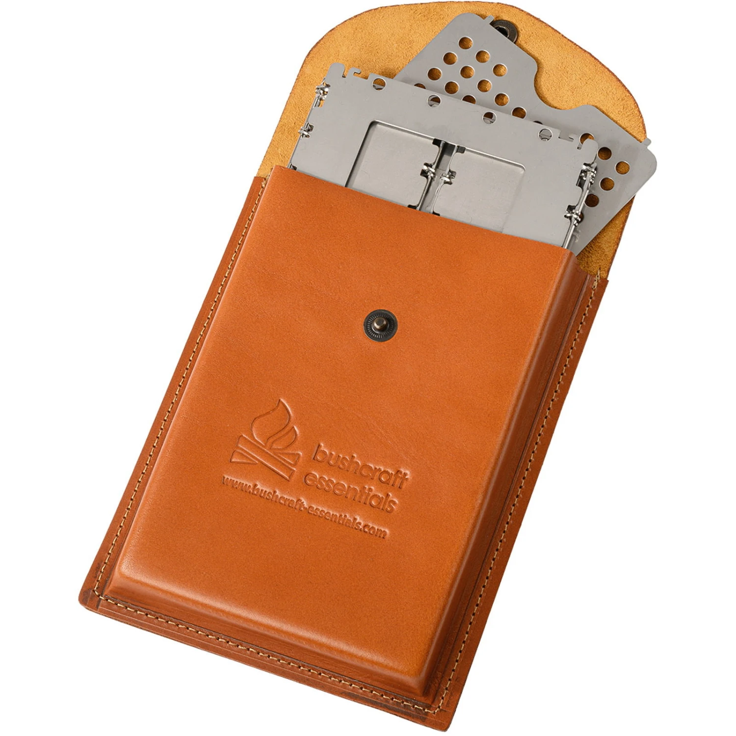 Das Bushbox XL Premium Set von bushcraft essentials besteht aus der Bushbox XL, einem Topfaufsatz, einem Universalrost und einer hochwertigen Ledertasche. Der Bushbox XL Kocher ist der größte Kocher im Bushcraft-Sortiment und ideal für längere Outdoor-Trips, Camping, Trekking, Bushcraft-Abenteuer, für Biker, Expeditionen und vieles mehr. Die Bushbox XL ist ein äußerst effizienter, tragbarer faltbarer Hobo-Kocher zum Grillen, Kochen und Wärmen. Zusammengeklappt ist er nur ca. 1 cm dick und Brennstoff gibt es überall in der Natur – Äste, Zweige, Laub, Tierdung. Halteposition für den Trangia Kocher. Zusammengeklappt ist dieser geniale Hobo-Ofen kaum einen Zentimeter dick und findet fast überall Platz. Die Bushbox XL wird einfach an den Scharnieren aufgeklappt und ist sofort einsatzbereit (der Aufbau ist auch mit Handschuhen oder klammen Händen kein Problem, wie sich auf Expeditionen gezeigt hat). Die Bushbox XL funktioniert nach dem Prinzip eines Kamins: Die Luft strömt von unten in den Kocher, bringt auch noch feuchtes Material zum Brennen und erzeugt eine starke Hitze, die noch dadurch verstärkt wird, dass die Hitze im Gegensatz zu einer offenen Flamme kaum zur Seite abstrahlen kann, sondern hauptsächlich nach oben gerichtet ist. Die Bushbox XL ist ein wahres Effizienzwunder. Mit nur wenigen kleinen Zweigen kann man in weniger als 4 Minuten Wasser zum Kochen bringen, Fleisch grillen, Essen zubereiten – und vieles mehr. Als Brennstoff kann praktisch jeder natürliche oder feste Brennstoff wie Holz, Rinde, Holzkohle (sogar trockener Tierdung), Spiritusbrenner, Esbit-Tabletten oder ein Gelkocher verwendet werden. Eine externe Wärmequelle (z.B. Trangia) kann mit Hilfe von zwei mitgelieferten Stäben in beliebiger Höhe in der Bushbox XL platziert werden. Diese Stäbe können auch auf die Oberseite des Kochers gelegt werden, so dass auch kleine Gefäße erwärmt werden können. Die mitgelieferten, sehr variabel einsetzbaren Topfaufsätze können alternativ als Höhenregulierung bei Verwendung anderer Wärmequellen, als Haltestange zum Transport oder Verschieben des heißen Kochers und als Halterung für den Trangia-Brenner verwendet werden.