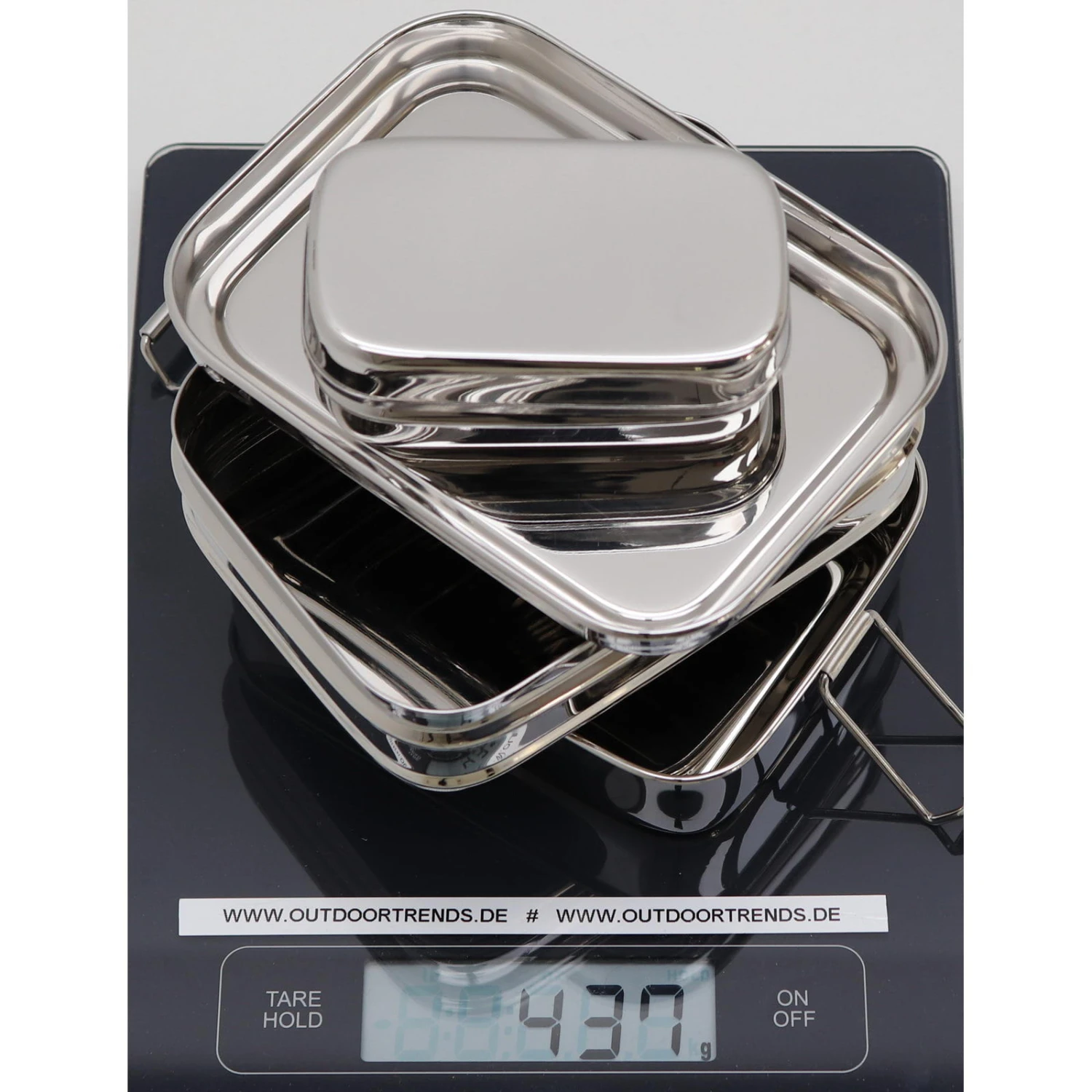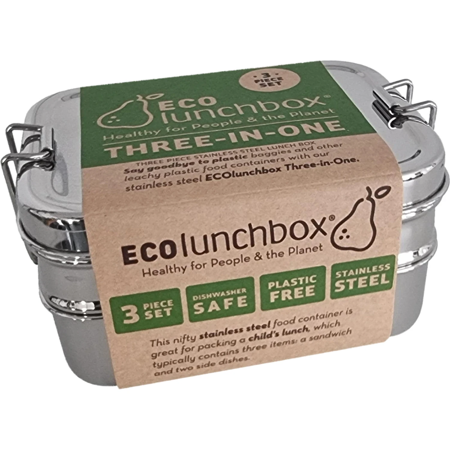 Die Three-in-One aus Edelstahl von ECOlunchbox ist eine 3-in-1 Proviantdose. Die großen Fächer fassen 355 bzw. 415 ml Volumen und werden für den Transport übereinander gestapel und mittels Deckel und den Softclose Klammern gesichert. In der kleinen Dose kann zusätzlich etwas untergebracht werden, sie fasst 140 ml und wird einfach durch Aufstecken des Deckels verschlossen. Diese Dosen sind alle für die Spülmaschine geeignet, jedoch nicht auslaufsicher da keine Dichtung vorhanden ist.