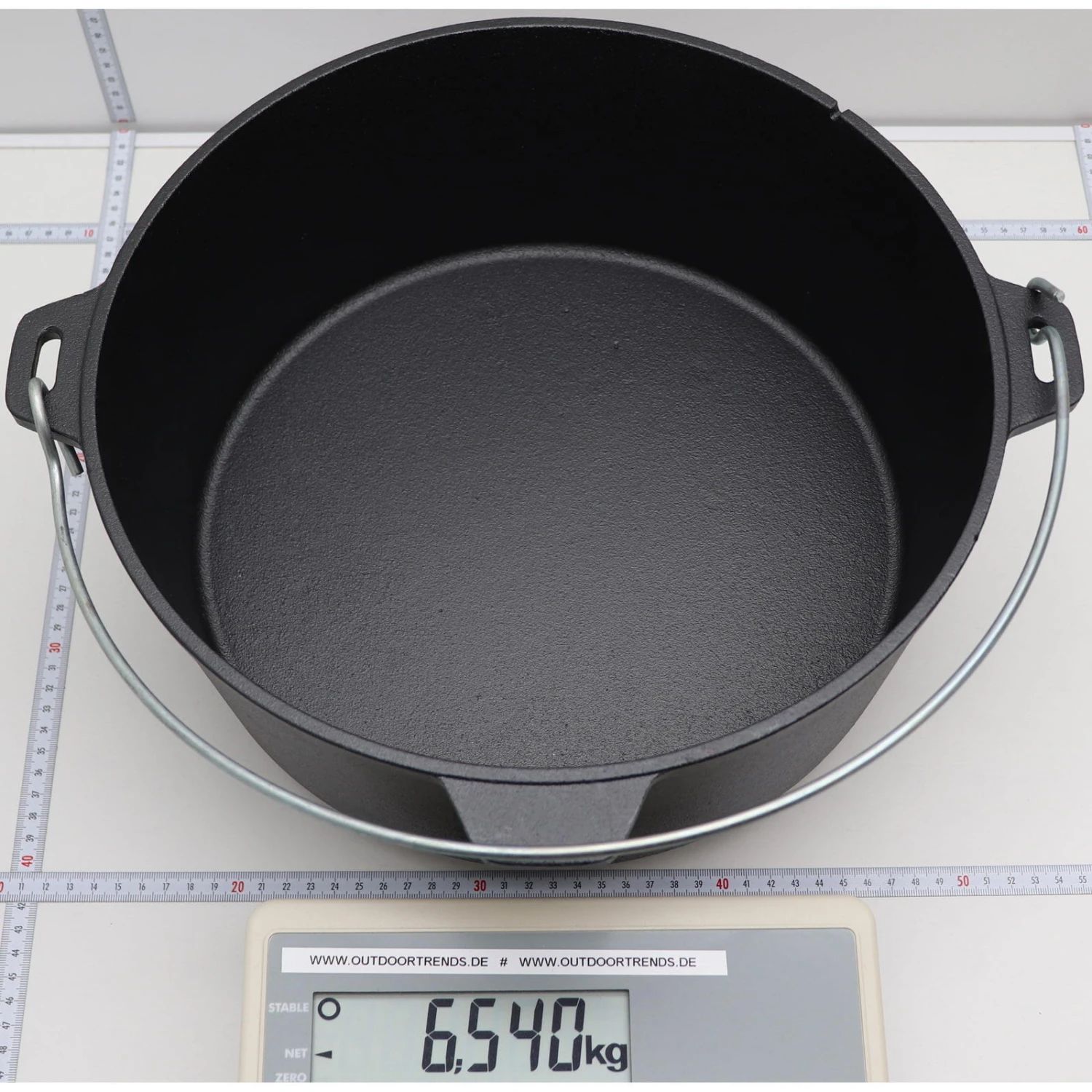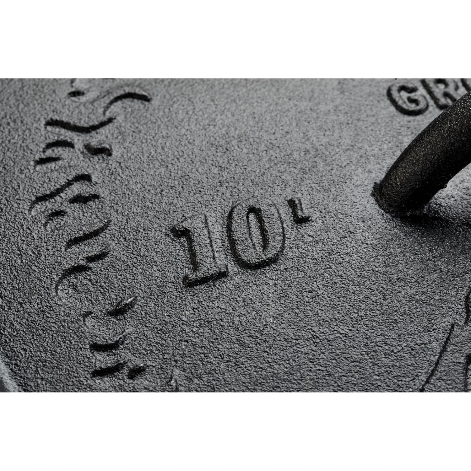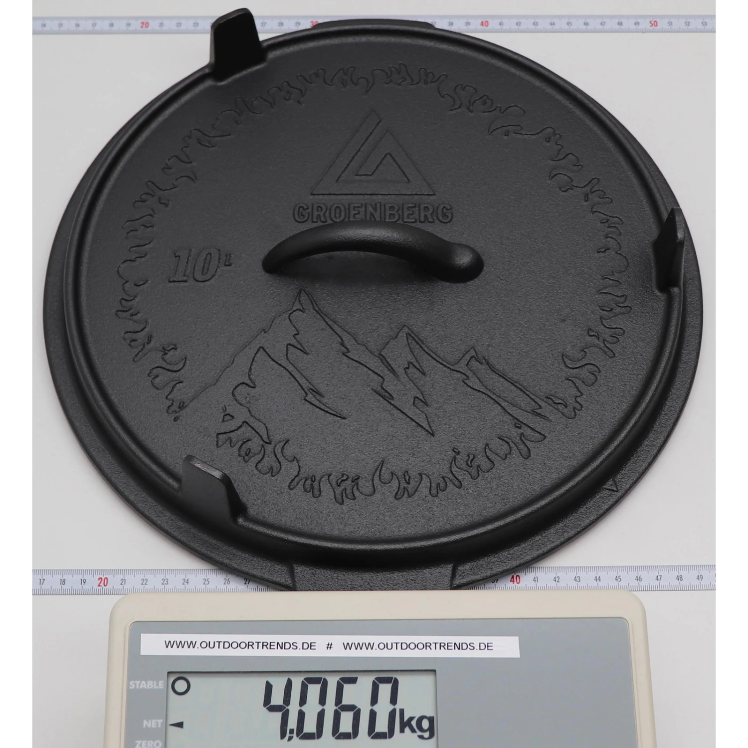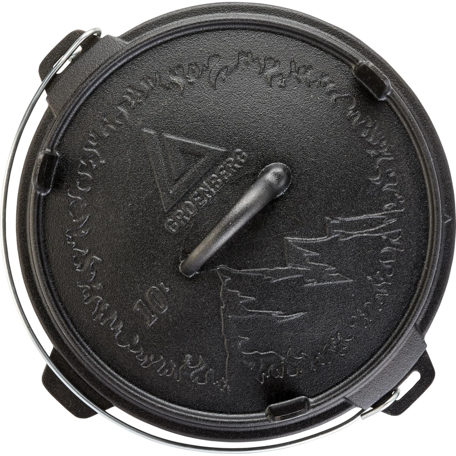 Der ASKJA POT 10L von Groenberg ist ein gusseiserner Topf mit hoher Wärmeleitfähigkeit und konstanter Rundumwärme. So werden Eintöpfe, Suppen, Gemüse, Fleisch oder Brot schonend zum Genuss. Der Deckel ist leicht konkav gewölbt damit das Kondenswasser im Inneren zum Rand hin abfließen kann und beim Anheben des Deckels nichts ins Gericht tropft. Ein Dampfauslass am Deckel verhindert lästiges Klappern oder Überkochen. Besonders Praktisch: Der Deckel lässt sich auch als Pfanne oder Servierteller nutzen und steht, dank seiner Füße auf der Oberseite, leicht erhöht und absolut sicher. Geeignet für Grill, Gasherd, Backofen oder offenes Feuer. Der Topf ist noch nicht eingebrannt und muss vor der ersten Benutzung entsprechend vorgenommen werden.