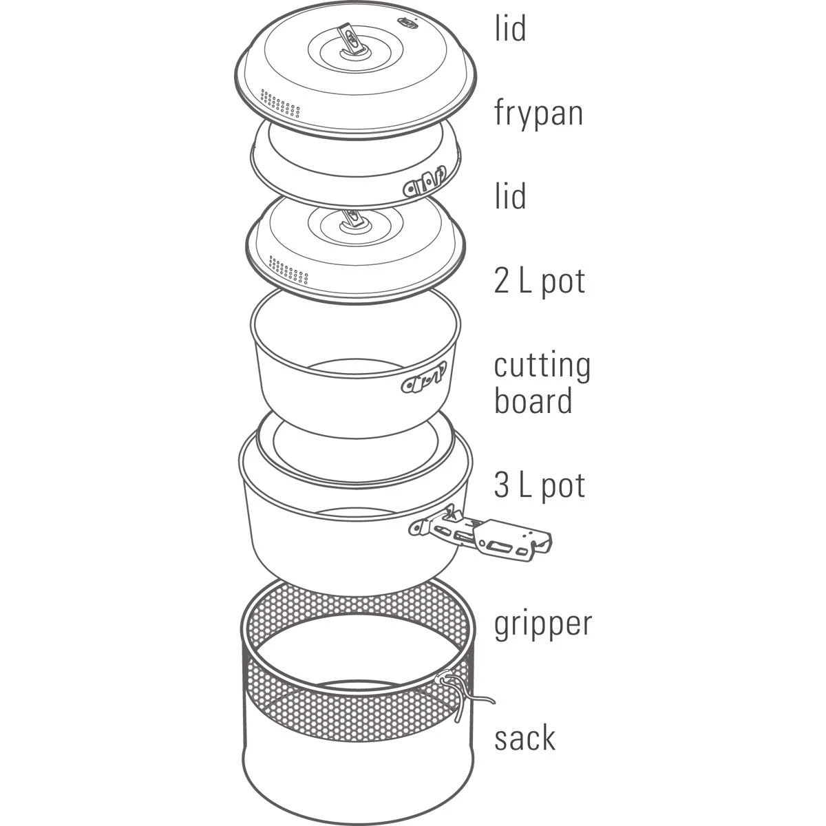 Das Kochset Bugaboo Base Camper in Größe medium von GSI bietet beste Qualität bei den Topfmaterialien, eine ausgefeilte Ausstattung des Topfsets und ein sehr gutes Finish. Das GSI Bugaboo Base Camper medium hat eine Teflon Beschichtung, welche gutes Handling und einfaches Reinigen sowie Abrieb- und Kratzfestigkeit der Töpfe garantiert. Das Set beinhaltet zwei Töpfe, eine Deckelpfanne, zwei Abgießdeckel, das praktische Schneidebrett (dient auch als Zwischenlage der Töpfe, damit diese nicht beim Transport klappern), die GSI-Komfortgriffzange und einen Packsack.