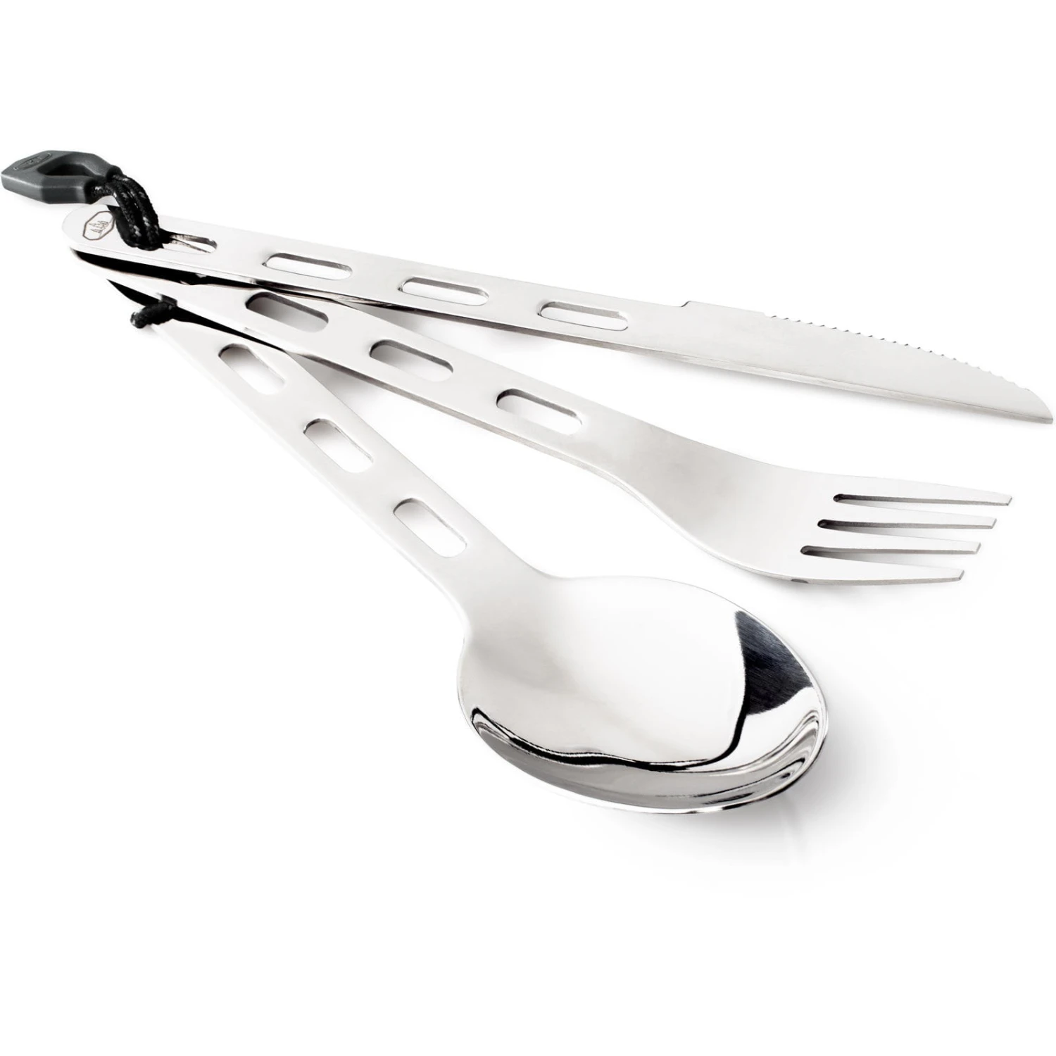 Schönes Edelstahlbesteck am praktischen Ring für Outdoor, Reise und Camping.