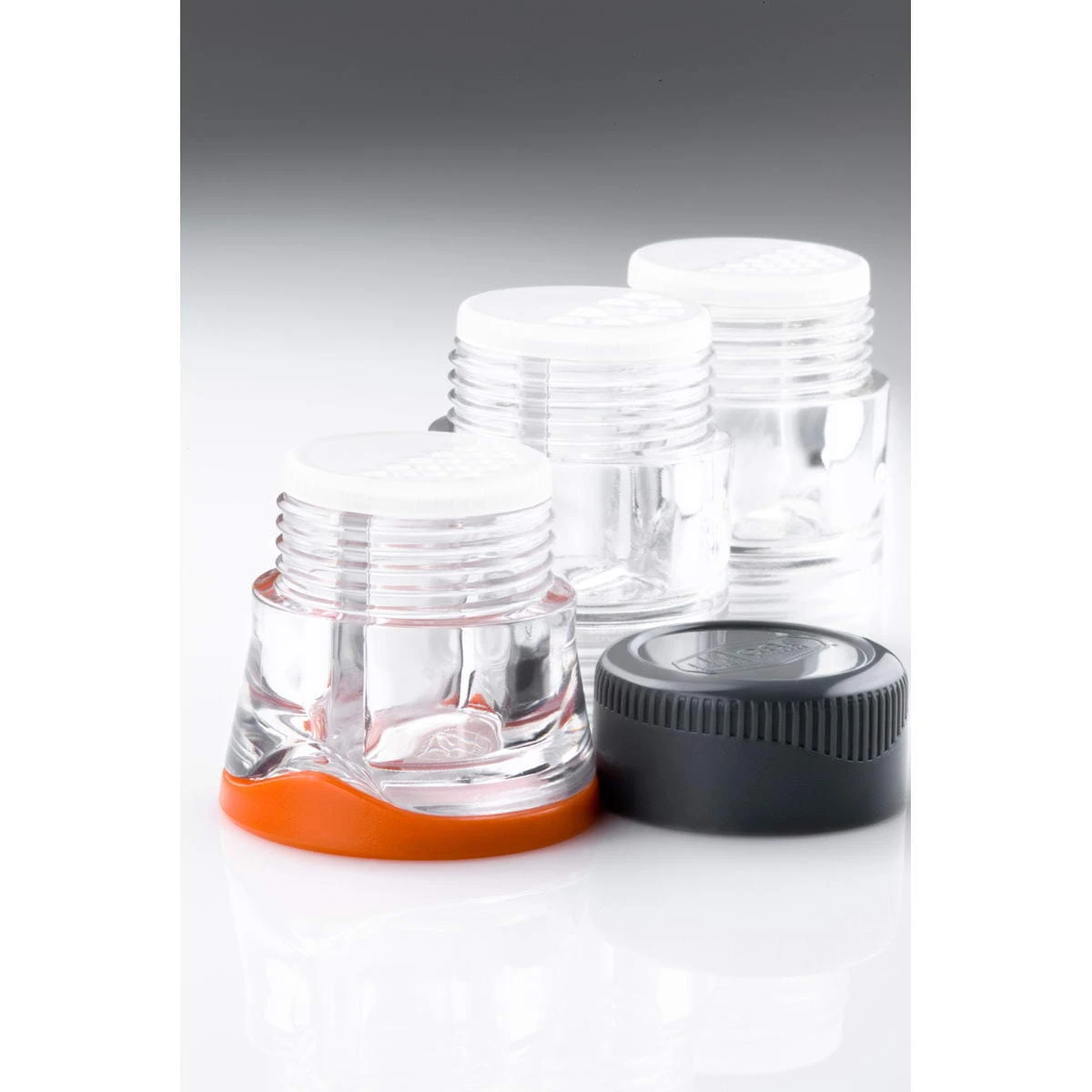 Ob diese ‚Rakete‘ auch für Weltraumeinsätze geeignet ist, wissen wir nicht, aber ein kleines Raumwunder ist sie schon. Salz- und Pfefferstreuer, zwei Behältnisse für Gewürze, eine wasserdichte Kappe und ein Bodendeckel zum Befüllen – natürlich abnehmbar. Alles zum Zusammenschrauben und deshalb sehr kompakt und ideal für alle Touren.