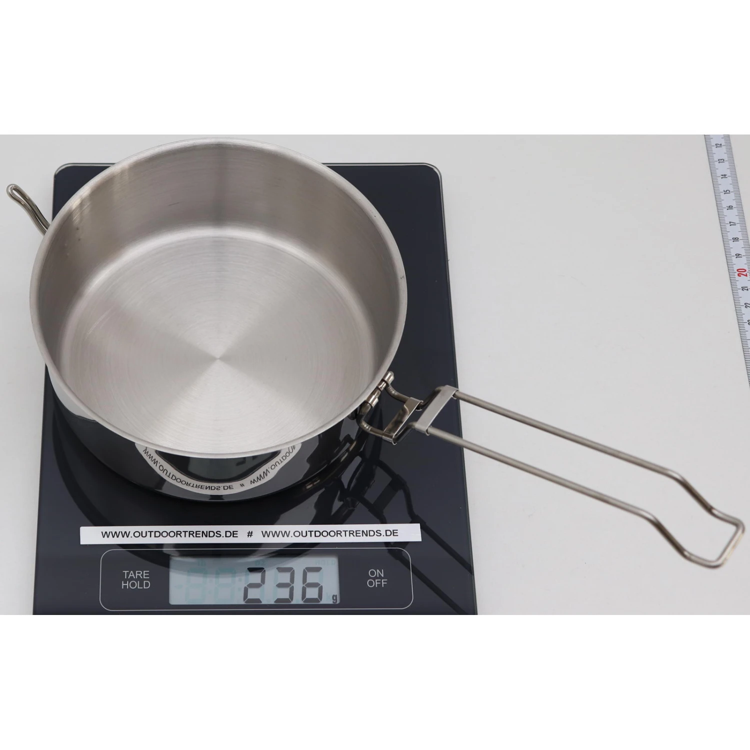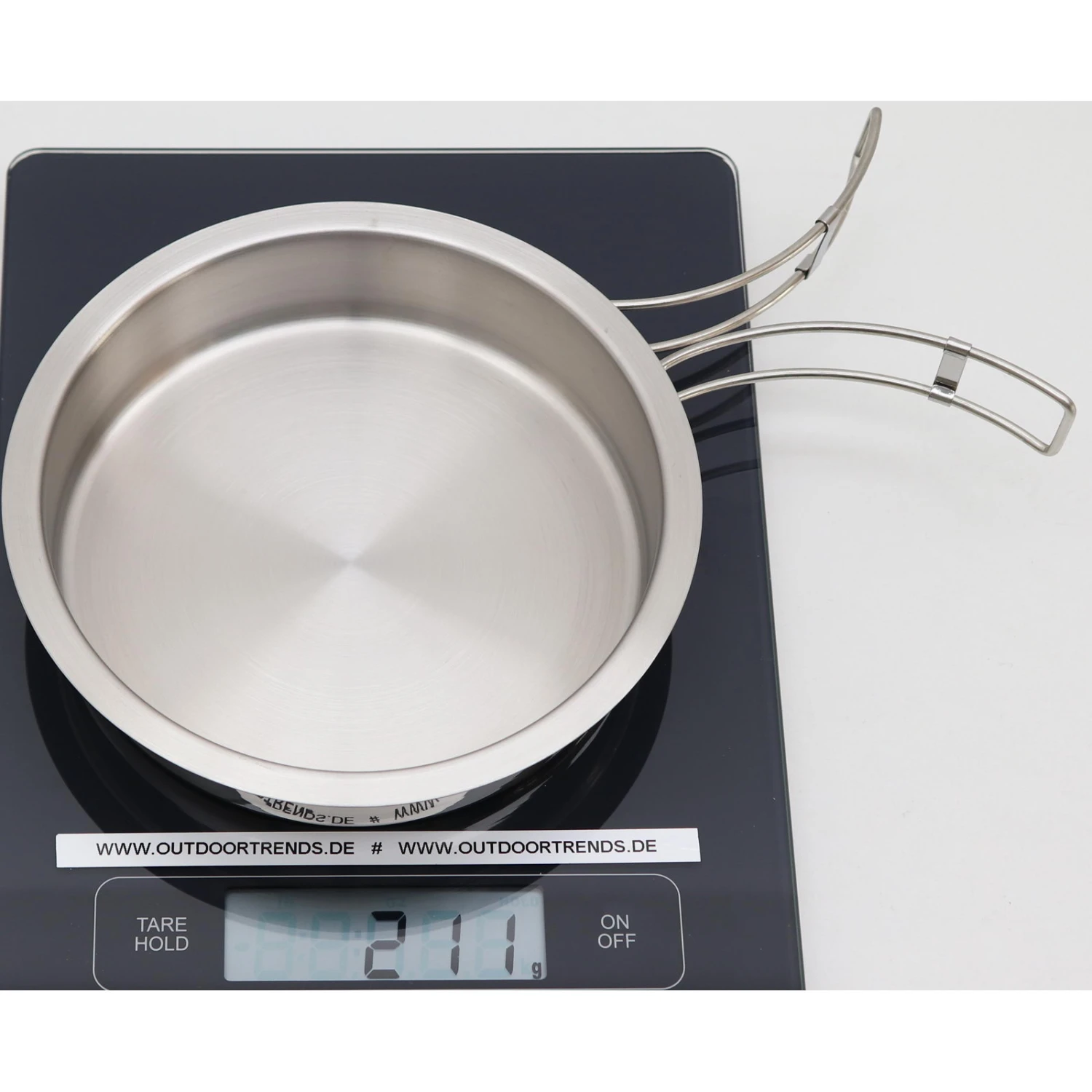 Das Snap-Pack von Origin Outdoors ist ein praktisches, robustes Kochset aus hochwertigem Edelstahl, bestehend aus einem Topf, einer Pfanne und einem tiefen Teller. Der Topf und die Pfanne verfügen über Klappgriffe. Darüber hinaus lassen sich Pfanne und Teller bequem in den Topf stapeln. Für einen sicheren Transport des Sets sorgt der am Topf angebrachte Schnappverschluss. Hiermit lassen sich der in den Topf gestapelte Teller und die Pfanne durch den Griff des Topfes fixieren. Das Set kann somit platzsparend im Gepäck verstaut werden.