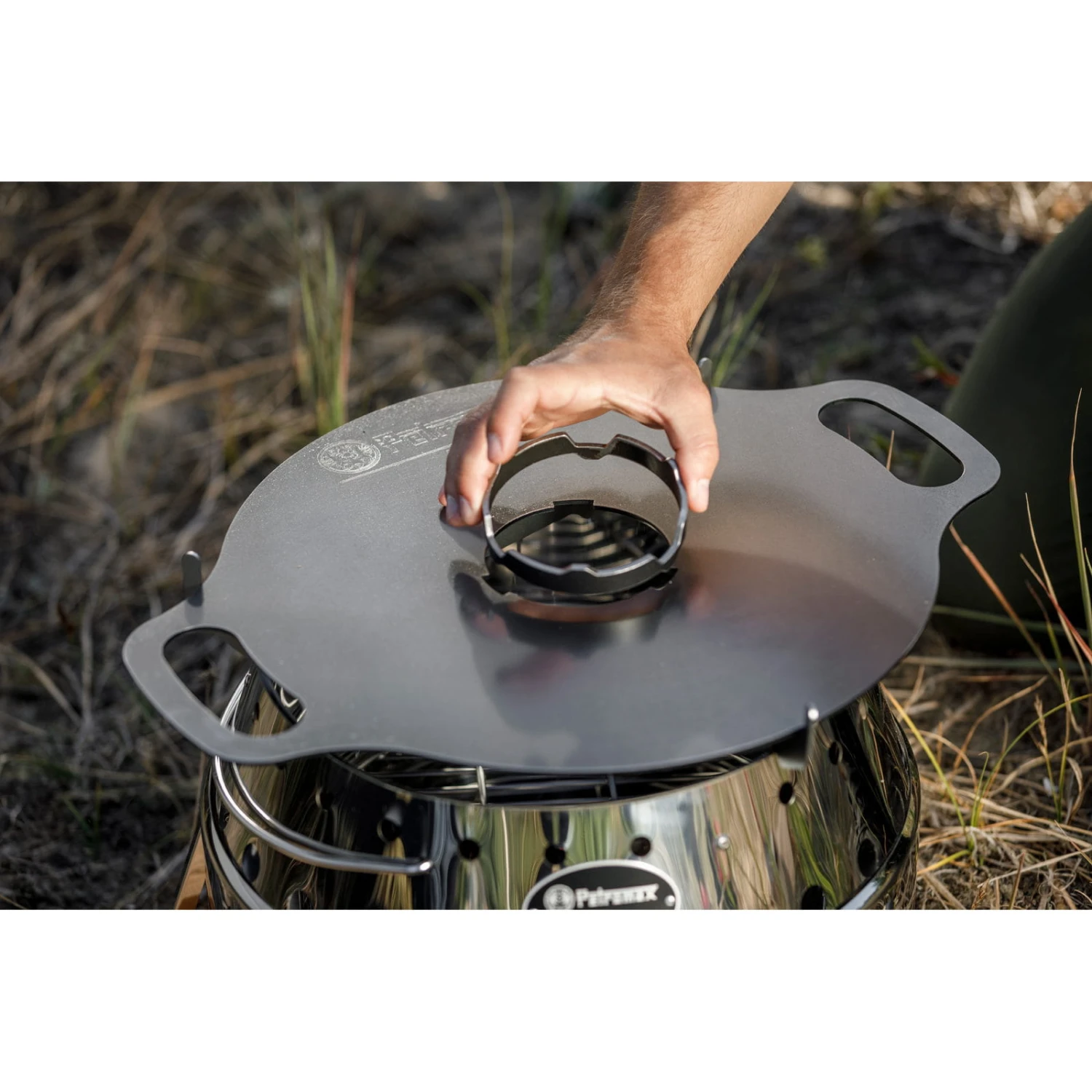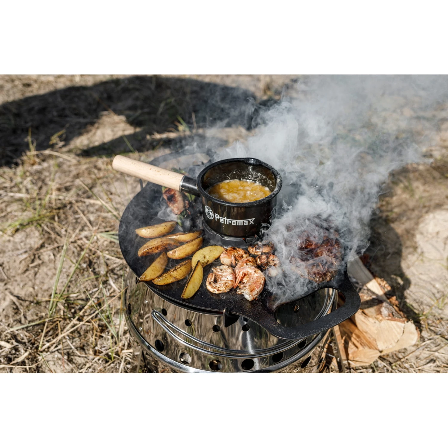 Der Petromax Kochaufsatz für die Atago Grillplatte ist deine flexible Ergänzung für das Grillen auf der Plancha-Platte: Der Kochaufsatz fügt sich genau in die Aussparung deiner Grillplatte ein und sorgt dafür, dass das Grillgut sicher auf der Platte bleibt. Darüber hinaus dient der Aufsatz für direkten Flammenkontakt zur Zubereitung von Saucen, Suppen, Pfannengerichtn oder Kaffee, während deine stärkende Mahlzeit auf der Atago Grillplatte brutzelt. So hast du mit einem kleinen Feuertopf, Saucentopf oder einer Kasserolle die Möglichkeit, eine Grillsauce, eine deftige Vorsuppe oder eine würzige Beilage zuzubereiten. Anschließend kannst du mit dem Perkolator einen aromatischen Kaffee kochen oder mit der kleinen Teekanne einen Wildkräutertee. Auch mit Kochaufsatz kannst du Kohle und Holz einfach in der Mitte der Atago Grillplatte nachfüllen. Der Aufsatz für die Atago Grillplatte ist made in Germany und zeichnet sich durch eine hohe Qualität aus. Kombiniere ihn mit dem Einsatz für die Atago Grillplatte, wodurch auch die kleine Kochausrüstung sicher steht oder durch den Mini-Grillrost die typischen Grillstreifen auf deinem Grillgut entstehen.
