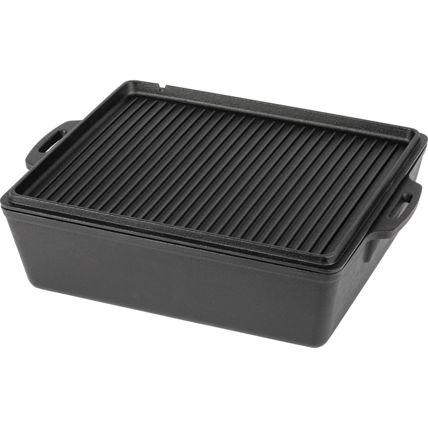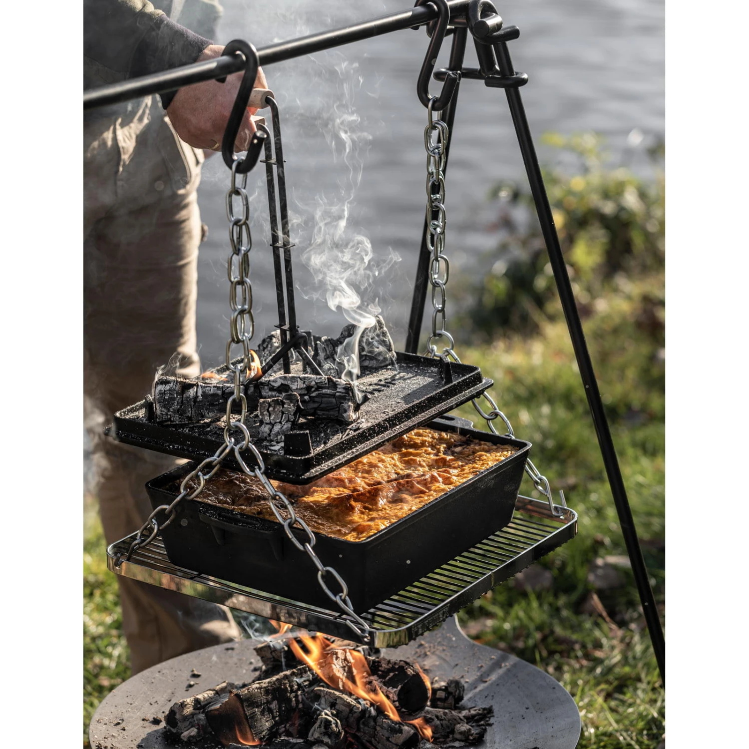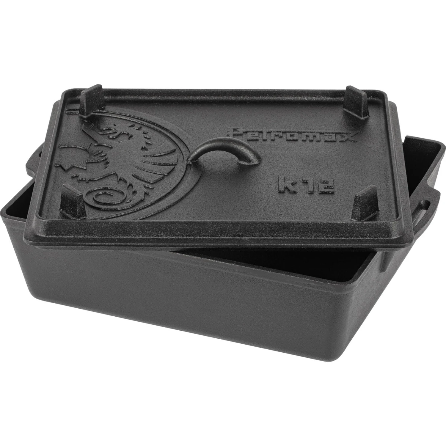 Mit der extragroßen Kastenform k12 versorgt man eine ganze Mannschaft in der Lagerfeuer-Küche. In der mit 8 Liter Füllvolumen geräumigen Form aus hochwertigem Gusseisen gelingen Brot mit krosser Kruste, überbackene Aufläufe und alle Arten von Fleischgerichten. Marinierten Wildschweinbraten mit Rotwein-Preiselbeer-Soße und Beilagen bereitet man in der sofort einsatzbereiten Kastenform aus Gusseisen ebenso zu wie Lasagne oder klassischen Kartoffelauflauf für eine große Gruppe von Draußen-Abenteurern. Der k12 ist ideal als Bräter, Auflaufform oder zum Brot- und Kuchenbacken. Mit dem Deckelheber (optional erhältlich, RL.402404) lässt sich der Deckel einfach und gefahrlos abnehmen. Dieser besitzt ein Rillenprofil, wodurch er auch als Steak- und Grillpfanne gut geeignet ist.