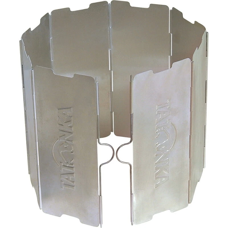 Aluminium-Windschutz 8-teilig von Tatonka für die Kochstelle. Einfach um den Kocher herumfalten und mit zwei Schiebern im Boden verankern, fertig. Mitgenommen wird der Faltwindschutz im super leichten Nylonbeutel.