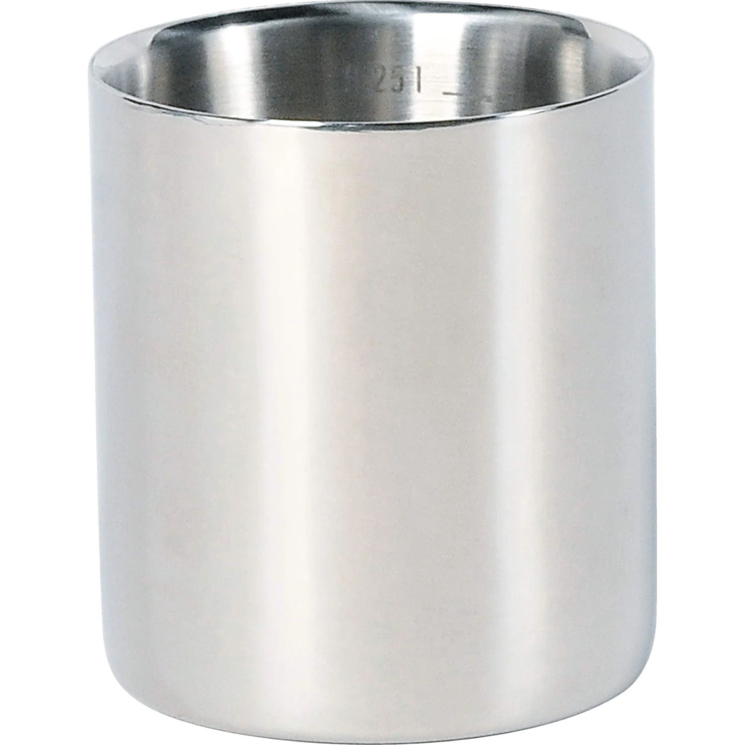 Doppelwandiger Edelstahlbecher ohne Henkel, aber mit Deckel. 250 ml Fassungsvermögen. Lebensmittelecht und resistent gegen Fruchtsäuren.